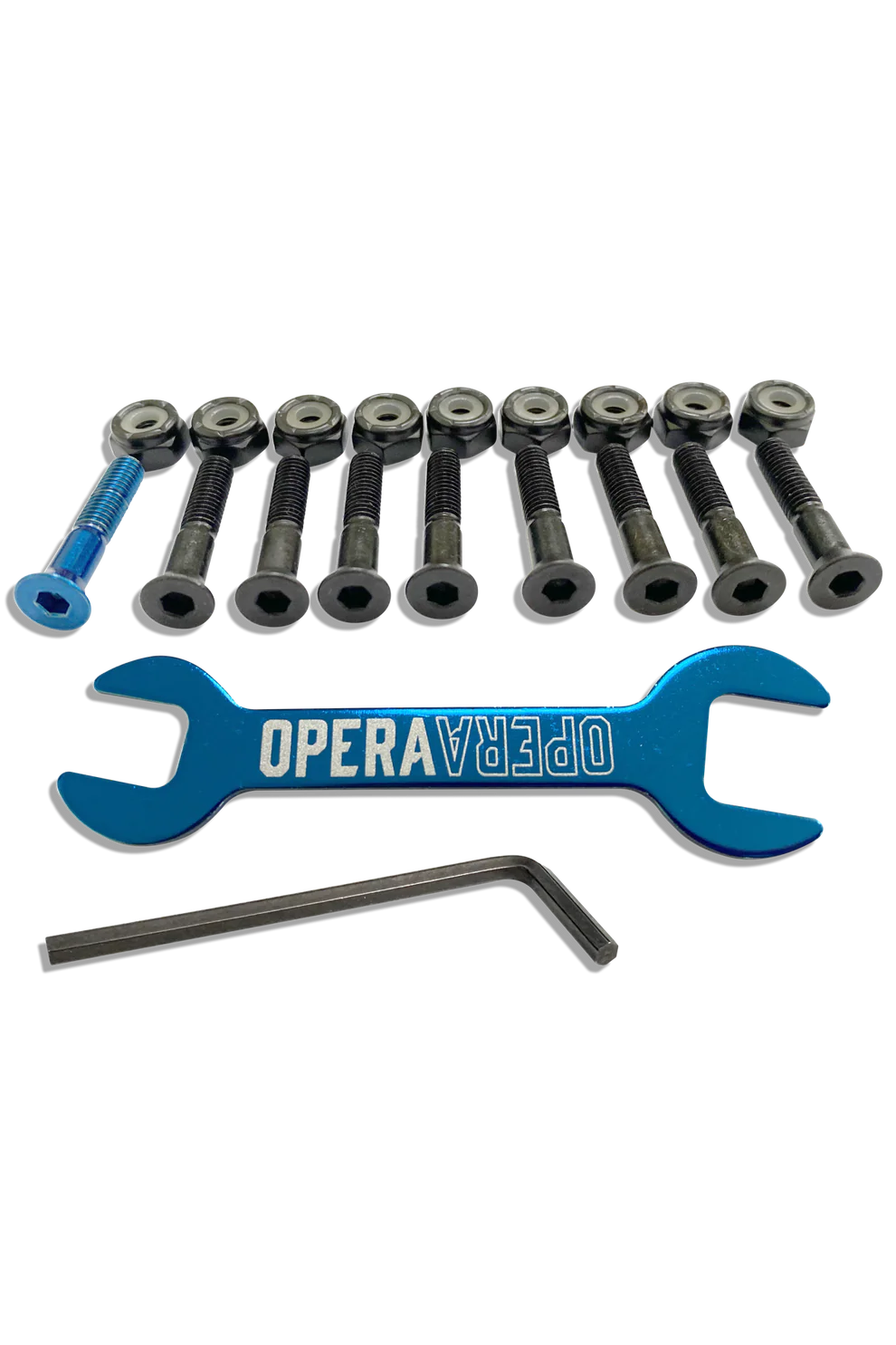 • 8 black / 1 anodized blue bolt