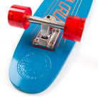 5 Ply Rocker Retro Cruiser featuring 70s inspired graphic art theme on full dip transparent blue with metallic undercoat, debossed nose and tail logos, authentic 5 Ply rocker construction and shape, Independent 109 trucks, 55mm - 78a OJ Mini Hot Juice wheels, and Independent riser pads.